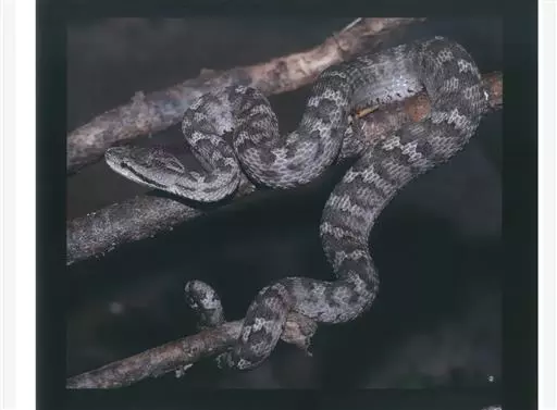 蛇岛蝮体色多以银色、灰色为基调,配合浅黑色的幼条体纹,头部双眼位置有黑色纹带,此类蛇被称为“黑眉蝮蛇”。