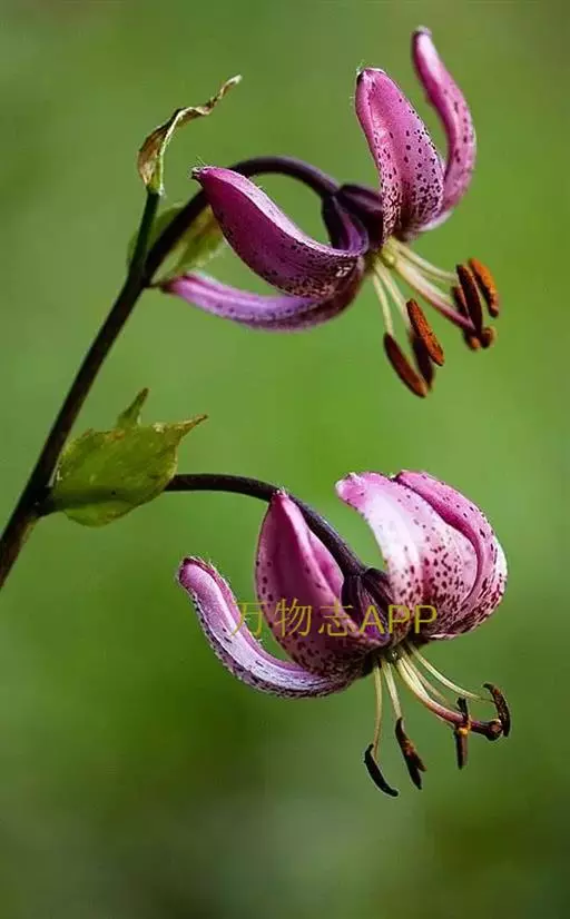 总状花序有花1-6朵;苞片叶状,条形,长约2厘米,顶端不加厚;花梗长6-18厘米,直立,先端弯曲;花下垂,有香味;花被片披针形,反卷,长3.5-4.5厘米,宽8-10毫米,先端钝,淡紫红色,下部有深紫色斑点,蜜腺两边密生乳头状突起;花丝长约2厘米,无毛,花药长1.4厘米,黑紫色;子房圆柱形,长8-10毫米,宽2毫米;花柱长1.5-1.7厘米。花期7月。