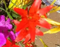 垂花百合(学名:Lilium cernuum Komar.):别名松叶百合,为百合科百合属草本宿根植物,鳞茎矩圆形或卵圆形,高约 4 cm,直径约 4 c m; 鳞片披针形或卵形,白色. 茎高约 65 cm,无毛. 叶细条形,长 8 ~ 12 cm,宽 2 ~ 4 mm,先端渐尖,边缘稍反 卷并有乳头状突起,中脉明显. 总状花序有花 1 ~ 6 朵。