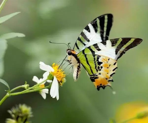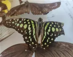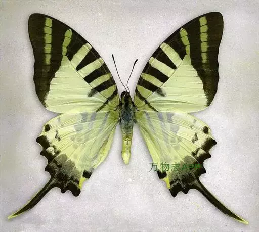 形态 成虫:翅展70—85 mm。体黑褐色,具黄白色毛;翅淡黄白色。前翅有7条黑褐色横带(中室及其端部共有5条,故又称五纹绿凤蝶):基部1条和外缘1条通到后缘,亚基区1条终止于cu2室,中前区、中区及中后区3条终止于中室后缘,亚外缘区1条终止于m3室。但从基部数第4条黑带变化很大,端部常变得很窄或只达中室的中部,有时只在前缘处明显,其余部分消失。更有甚者,前翅总共只有4条黑带。后翅的颜色及斑纹基本上都是反面透露过来的,所以看着似显非显,惟独 绿凤蝶 尾突和外缘各翅室的淡黑色条纹全部是正面的本色。翅反面前翅与正面相似。后翅基半部淡黄绿色,端半部淡黄白色;在基半部淡黄绿色区内有3条黑褐色带直到臀角及其附近;中区有1列大小不一的斑,靠前缘1个新月形,紧接其下的1个大而略呈圆形;亚外缘有1列断续的条斑;外缘波状,随波有黑色斑,斑外侧镶灰白边;尾突长,黑褐色。 雄性外生殖器爪形突消失,尾突猫耳状,与背兜结合在一起很像猫头;背兜宽;抱器瓣短而略呈半圆形,抱器端强度骨化,具强刺丛;内突2枝,大齿状,其中1枝被端部强刺所遮盖;阳茎长而弯曲,末端钝。 雌性外生殖器产卵器半圆形;后表皮突粗长,末端钝;后阴片宽带状,似蝴蝶结;前阴片宽大,倒“U”形;囊导管粗长;交配囊椭圆形;囊突指状,较长。 幼虫:老熟幼虫头部淡灰褐色,有黑色毛。前胸背板茶色,左右两侧有1对具光泽的黑色短突起。中、后胸茶色,亚背线上各有1对黑色的小突起,其基部围有淡青色的环纹。胸部各节的气门线上有1条深褐色的宽纵带,其下方有1条淡黄色的纵带与之平行。腹部稍呈淡褐色,各节周边泛黄色。第1—8腹节散生许多淡黄色的小斑点。第1—9腹节的气门线上有1条深褐色的宽纵带。第10腹节茶褐色,左右有1对突起,突起淡灰色生短黑毛,平行地伸向后方,末端尖。胸足、腹足及臀足淡灰色。 蛹:头部稍扁平,前缘部圆四角形。从侧面观察,头部和中胸的突起的基部在背线上连接成直线。中胸背线上的1根突起短小,黄色,末端圆而前伸。从该突起发出2条明显的黄色隆起,经背线两侧向后到第10腹节背面时合二为一。身体黄绿色半透明,腹面呈淡绿色。从头部前缘伸出的暗褐色斑纹,经眼和前翅基部,终止于第3腹节。头部背线上的暗褐色带经前胸和中胸背线止于中胸突起的末端。腹部各节各有1条不明显的斜线。体长约30 mm