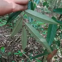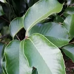 叶厚纸质或近革质,椭圆形,卵形或长圆形,长12-30厘米,宽4-10厘米,很少较窄,顶端短或长渐尖,基部近于圆,或短尖,常一侧略歪斜,全缘或有时在顶部有少数裂齿,中脉在叶面平坦或下半段微凸起,侧脉生边10-15 条,网状直脉尚可见或甚明显,嫩叶两面同色,成长叶背面带苍灰色;叶柄长1.5-3厘米。