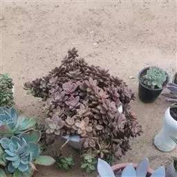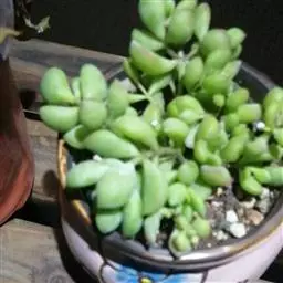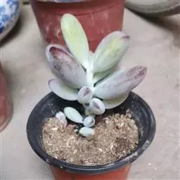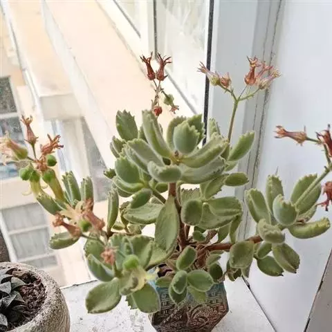 乒乓福娘,植株叶片退化成扁卵状,植株为直立的肉质灌木,能够长高。叶片对生,扁卵型至圆卵形,叶片顶端紫红圆叶尖,叶面有一层白粉。强光下叶片的顶端边缘会较红。初夏开花,聚伞状圆锥花序,花序较高,小花管状下垂,花开橙红色,先端五裂,花蕾看起来象一个个挂着的小辣椒。
