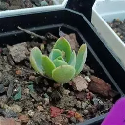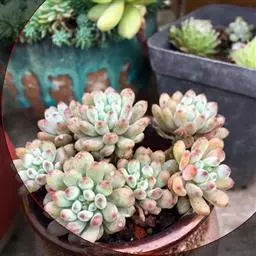 福娘为景天科银波锦属的肉质草本植物。对生的叶片呈短棒状,叶色灰绿,表覆白粉,叶缘外围镶着紫红色,…