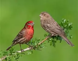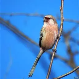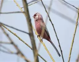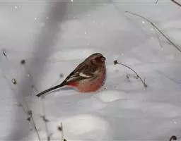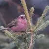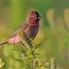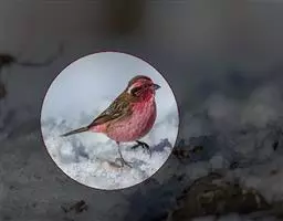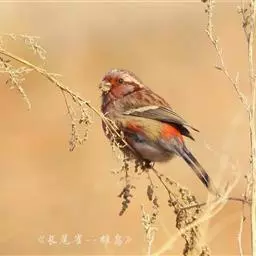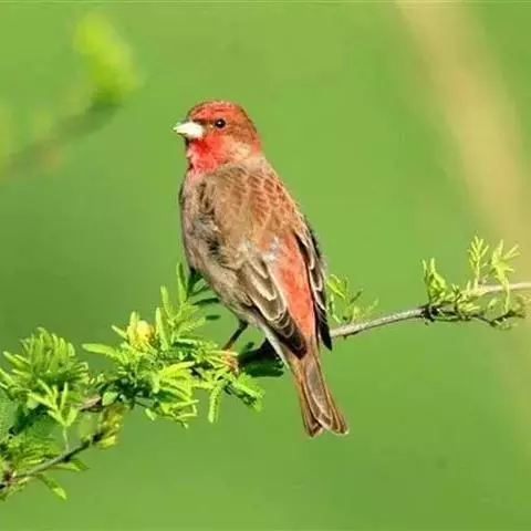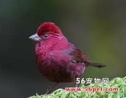 红腰朱雀:体长12-14厘米,小型鸟类。雄鸟前额和眉纹玫瑰粉红色,头顶和一宽的贯眼带深红褐色,背红…