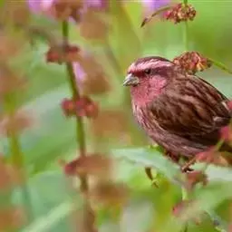 红眉朱雀:体长15厘米,是一种中等体型的朱雀。上体褐色斑驳,眉纹、脸颊、胸及腰淡紫粉,臀近白。…
