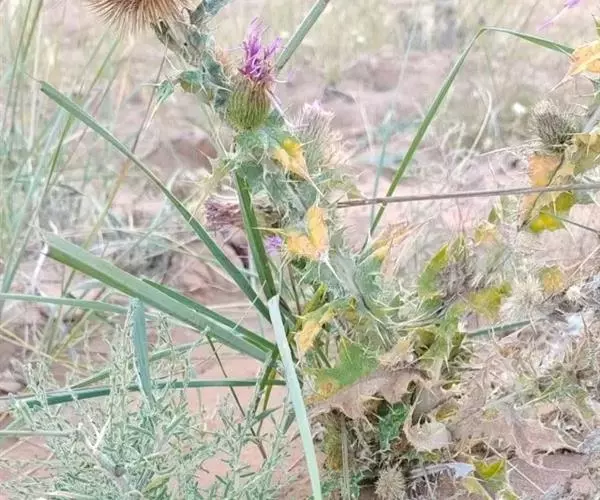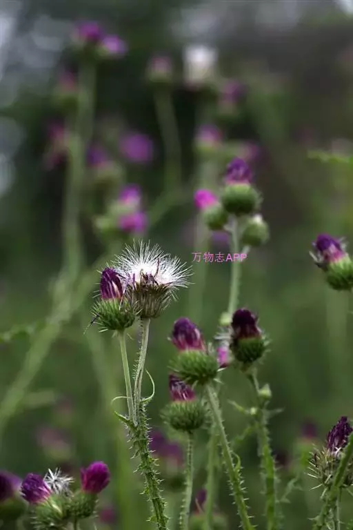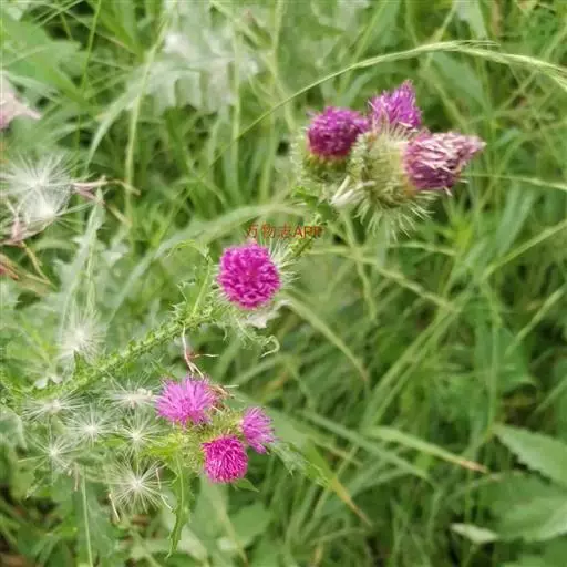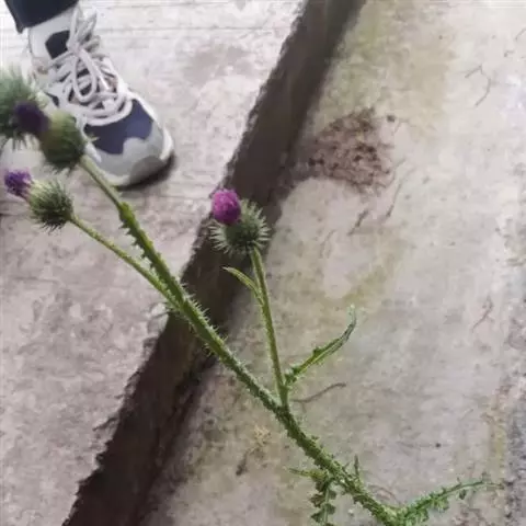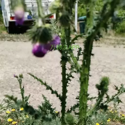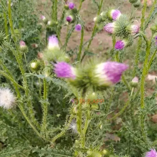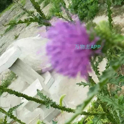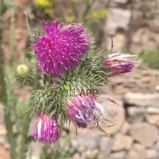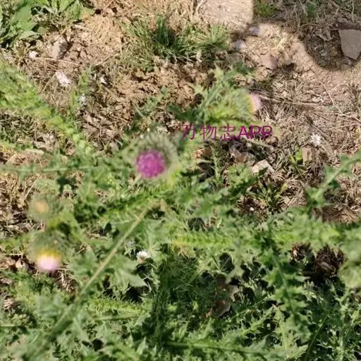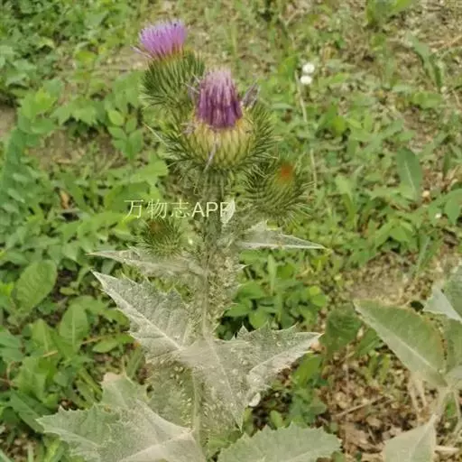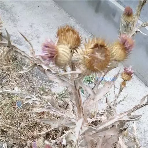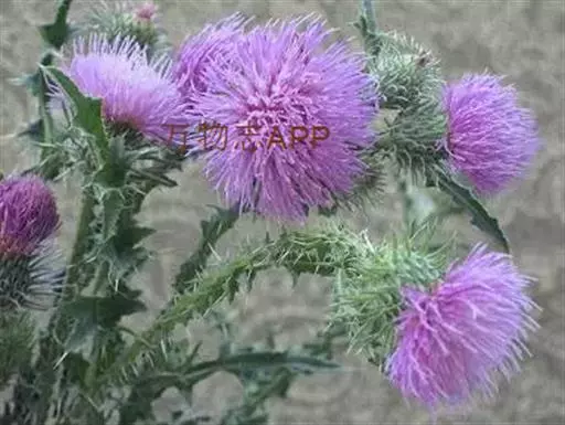 飞廉属菊科植物,为二年生或多年生草本植物,茎圆柱形,具纵棱,并附有绿色的翅,翅有针刺。叶椭圆状披针形,羽状深裂,裂片边缘具刺,头状花序干缩,总苞钟形,黄褐色,花紫红色,冠毛刺状,黄白色,气味微弱。