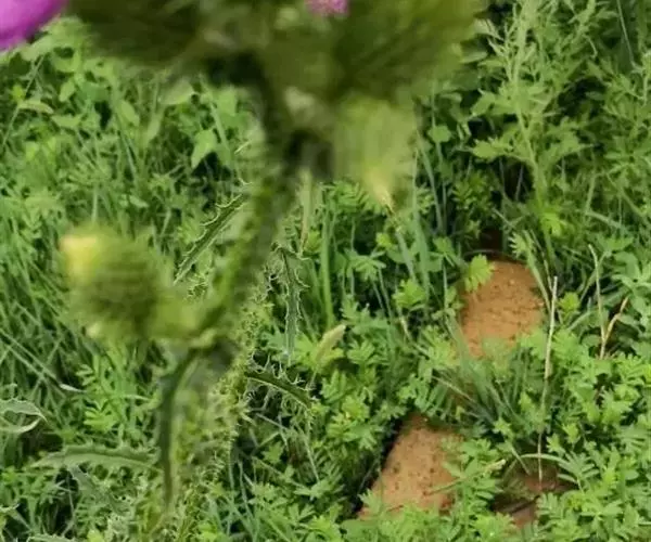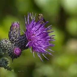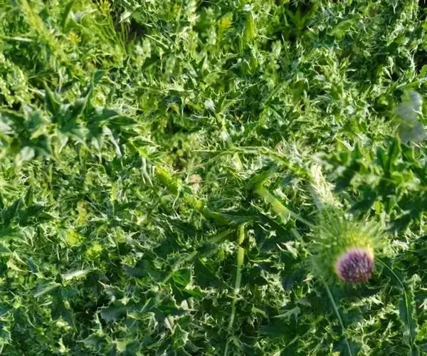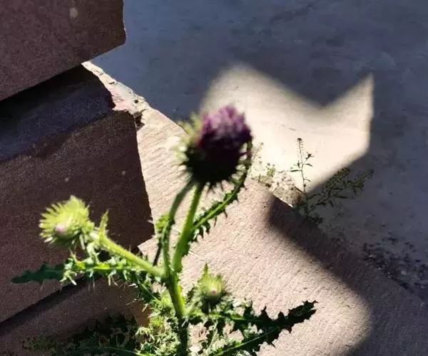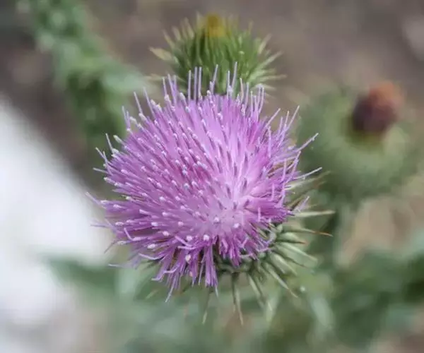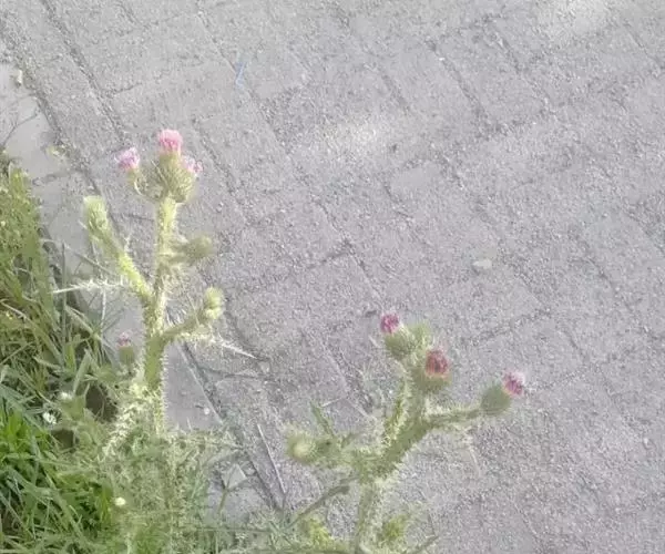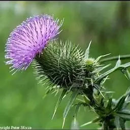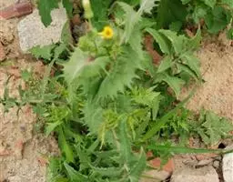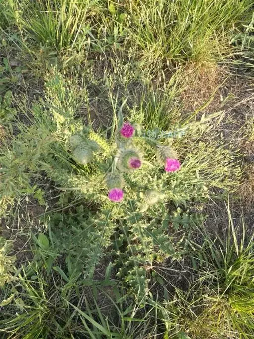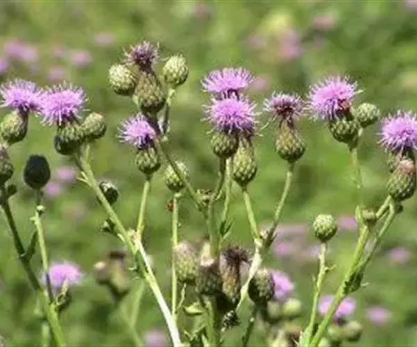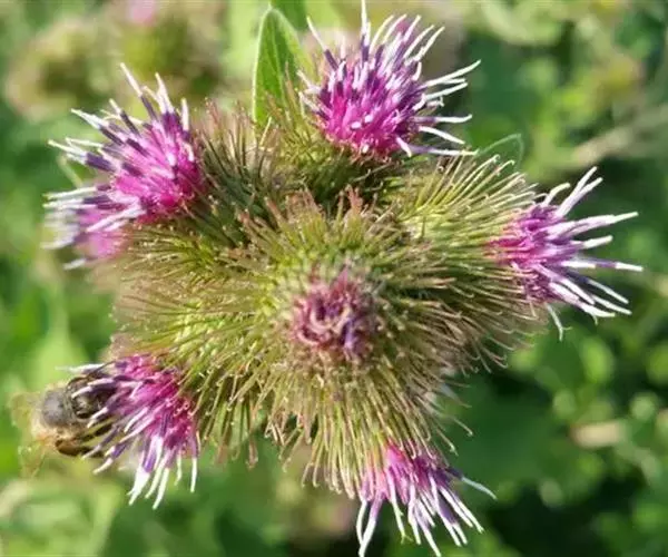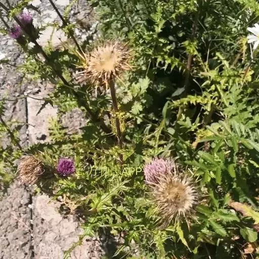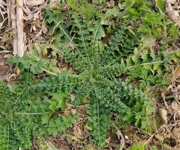 飞廉属菊科植物,为二年生或多年生草本植物,茎圆柱形,具纵棱,并附有绿色的翅,翅有针刺。叶椭圆状披针形,羽状深裂,裂片边缘具刺,头状花序干缩,总苞钟形,黄褐色,花紫红色,冠毛刺状,黄白色,气味微弱。