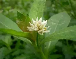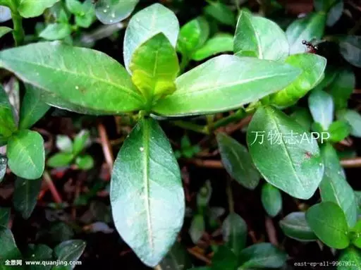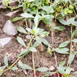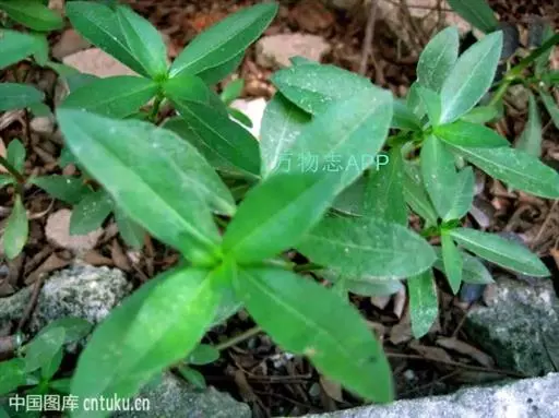 鉴别特征:水生型植株无根毛,茎长达1.5~2.5m;陆生型植株可形成 喜旱莲子草 直径达1cm左右的肉质贮藏根,有根毛,株高一般30cm,茎杆坚实,节间最长15cm,直径3~5mm,髓腔较小。叶对生,长圆形至倒卵状披针形。头状花序具长1.5~3cm的总梗。花白色或略带粉红,雄蕊5。