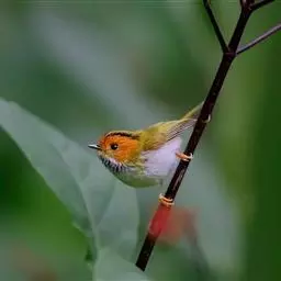 棕脸鹟莺:体长10厘米,是一种色彩亮丽而有特色的莺鸟。头栗色,具黑色侧冠纹。上体绿,腰黄色。下体白,…
