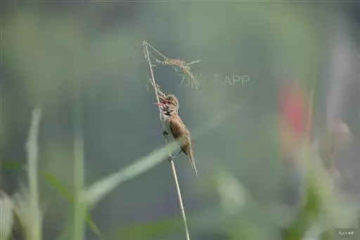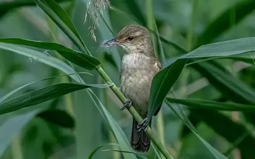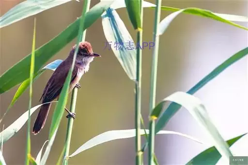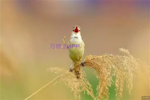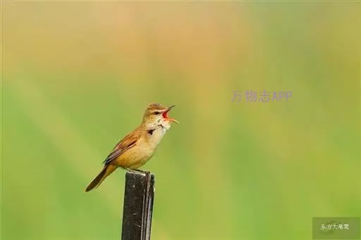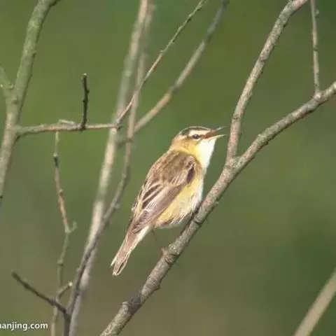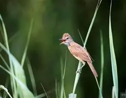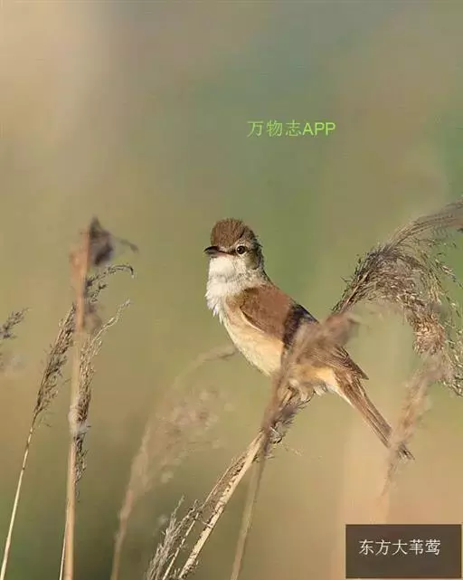 东方大苇莺(学名:Acrocephalus orientalis):体长18-19厘米,体重22-29克。体型略大的褐色苇莺。具显著的皮黄色眉纹。上体呈橄榄褐色。下体乳黄色。第1枚初级飞羽长度不超过初级覆羽。虹膜褐色;上嘴褐色,下嘴偏粉;脚灰色。
