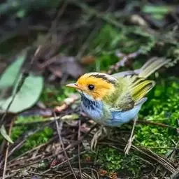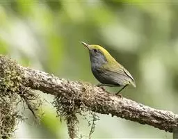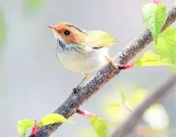 棕脸鹟莺:体长10厘米,是一种色彩亮丽而有特色的莺鸟。头栗色,具黑色侧冠纹。上体绿,腰黄色。下体白,…