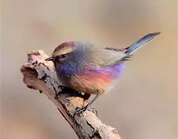 凤头雀莺:小型鸟类。体长9-10厘米,雄鸟呈毛茸茸的紫色和绛紫色,顶冠淡紫灰色,额及凤头白色,尾全蓝。…