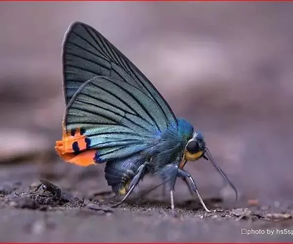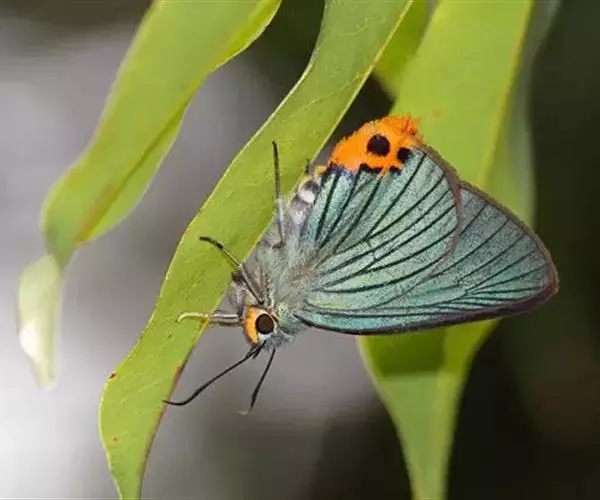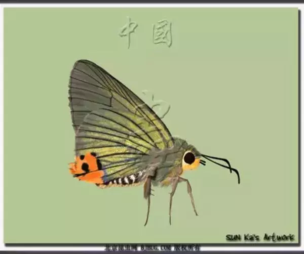 成虫:翅正面暗褐色,基部绿色;后翅臀角沿外缘有橙黄色带。翅反面黄绿色,翅脉黑色; 后翅臀角橙红色斑纹在2a室至cu1室间向内突出。