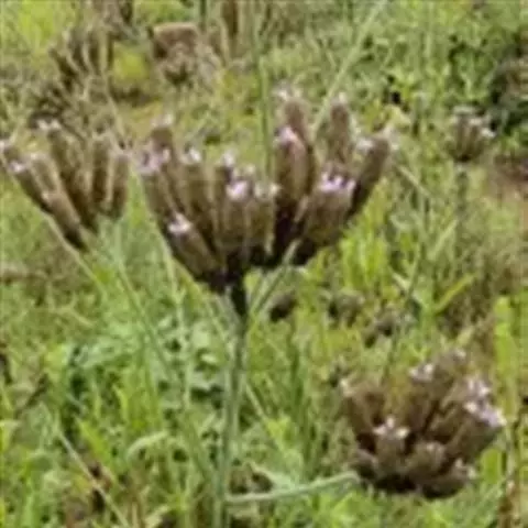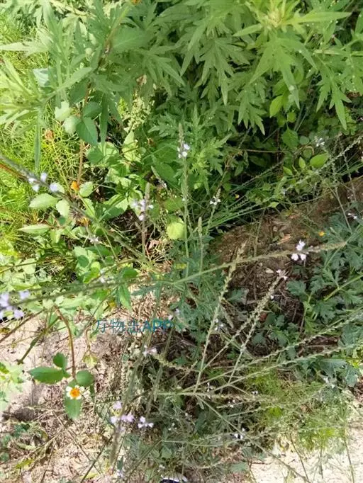 马鞭草 多年生草本,高30-120厘米。茎四方形,近基部可为圆形,节和棱上有硬毛。叶片卵圆形至倒卵形或长圆状披针形,长2-8厘米,宽1-5厘米,基生叶的边缘通常有粗锯齿和缺刻,茎生叶多数3深裂,裂片边缘有不整齐锯齿,两面均有硬毛,背面脉上尤多。 穗状花序顶生和腋生,细弱, 结果时长达25百米花小,无柄,最初密集,结果时疏离;苞片稍短于花萼,具硬毛;花萼长约2毫米,有硬毛,有5脉,脉间凹穴处质薄而色淡;花冠淡紫至蓝色,长4-8毫米,外面有微毛,裂片5;雄蕊4,着生于花冠管的中部,花丝短;子房无毛。果长圆形,长约2毫米,外果皮薄,成熟时4瓣裂。花期6-8月,果期7-10月。