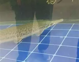 双须骨舌鱼(学名:Osteoglossum bicirrhosum):又名银龙鱼。成鱼鱼体长度在50-70厘米之间,最大可长至120厘米。是中大型淡水鱼类。体呈带状。口裂明显下斜,下颌盖住上颌,下颌具有类似育儿袋之构造可用于口孵仔鱼。颌须一对。眼睛大而灵活。鳞片大型,鳞片外缘呈粉橘色并随成长而逐渐淡化。臀鳍从肛门后方延续至尾柄,背鳍长度比臀鳍稍短。体延长,侧扁。口上侧位。吻须一对。头部和鳃盖部具有大型板状骨骼,为蜂窝状,可用以呼吸外界空气。背鳍与臀鳍较长,位于体后部。胸鳍大。腹鳍位于胸鳍的后方。尾鳍短小。体被大的鳞片,鳞片呈粉红色的半圆形状。体银白色,并含有蓝色、青色等淡混合色,闪闪发光。