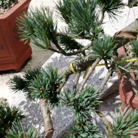 雪松盆景的加工造型以攀扎为主,结合修剪为辅。攀扎以冬春为宜,多采用棕丝进行攀扎。雪松主干耸立,侧枝平展,故多将侧枝做弯成S形状,主干一般不做弯,自然向上成大树型,姿态极为朴实美观。也可取当年生小苗5-7棵,高低错落,合栽成丛林式,枝叶婆娑,别具韵味。