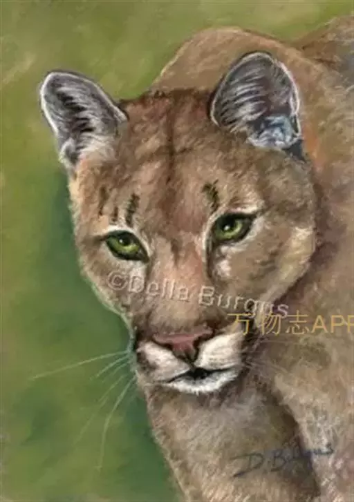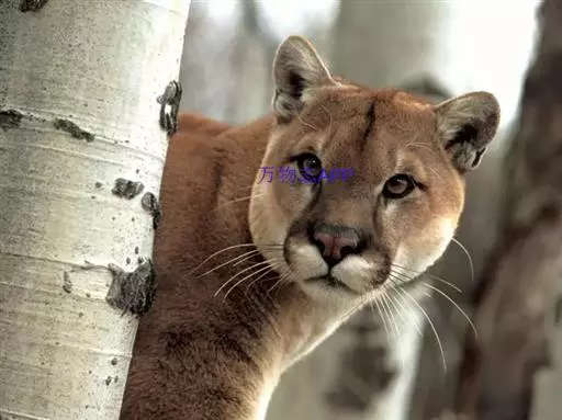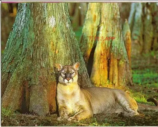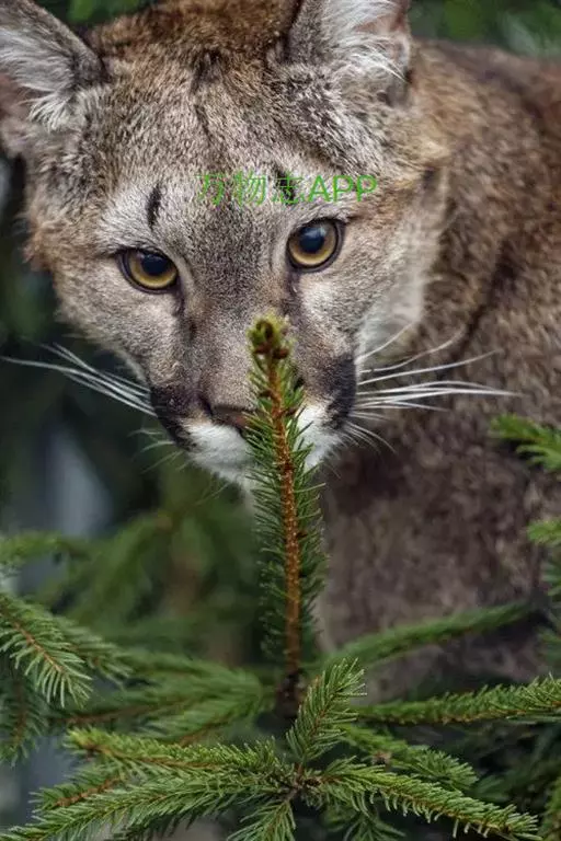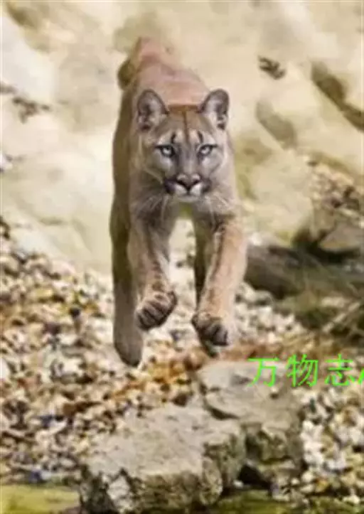 美洲狮(学名:Puma concolor):又称美洲金猫,大小和花豹相仿,但外观上没有花纹且头骨较小。体长130-200厘米,尾长约100厘米,肩高55-80厘米,体重35-100千克,为猫亚科中最大者。雄性比雌性大近1倍。躯体均匀,四肢中长,趾行性。头大而圆,吻部较短,视、听、嗅觉均很发达。犬齿及裂齿极发达;上裂齿具三齿尖,下裂齿具2齿尖;臼齿较退化,齿冠直径小于外侧门齿高度。皮毛柔软,全身为单一的灰色、红棕色或红色。前足5趾,后足4趾;爪锋利,可伸缩。尾较发达。