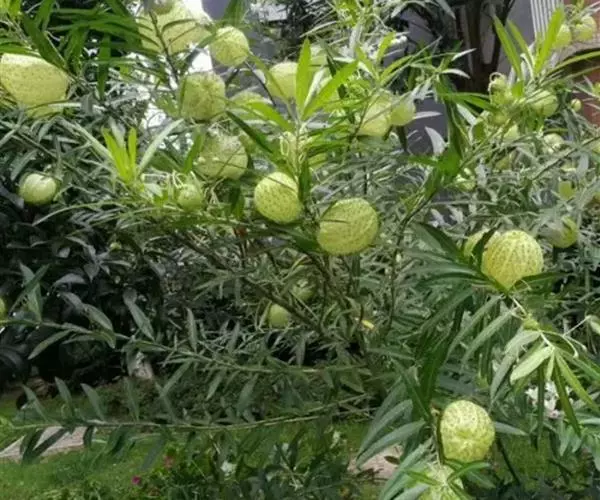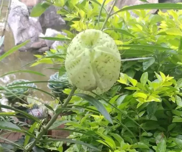 直立灌木,株高 80~150 公分,具多数分枝,具乳汁;枝条细长,直立或斜上升,嫩枝绿色,老枝灰白色,具细柔毛。叶对生,披针形或线状披针形,长 10~13 公分,宽 1~2 公分,先端渐尖或锐尖,基部钝而延伸至叶柄,纸质,全缘,表面呈有光泽的绿色,背面淡绿色;表里两面皆光滑无毛;中肋于表面略凹下而于背面显著隆起,侧脉不明显;叶柄长 0.5~0.9 公分,光滑无毛。花多数,白色,无香味,开放时径 0.9~1.1 公分,呈繖形状聚繖花序;花序抽自于对生叶之叶柄间,长 2~4 公分,略带柔毛;花柄细长,长 1.2~2 公分,有柔毛;花萼深 5 裂,裂片披针形,长 0.5~0.6 公分,先端渐尖,有毛茸;花冠几从基部便 5 裂;裂片卵状长椭圆形,反卷,长 0.7~0.8 公分,宽约 0.4 公分,先端钝,表里两面皆光滑无毛,毛缘;雄蕊柱长约 0.4 公分;副冠鳞片 5 枚,卵形白色,长 0.2~0.4 公分,先端钝。秋至春季开花。果实为蓇葖果,卵形或圆卵形,长 5~8 公分,径 3~6 公分,如膨胀的汽球,中空没有果肉,内藏多数种子,成熟时为绿色,密布刚毛或棘刺,也散生毛茸;成熟后后开裂,种子圆卵形,长 0.3~0.4 公分,无丛毛,成熟时带黑色,种子具白色绒毛可飞散,春至秋季结果。