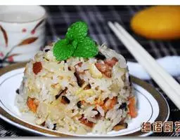 糯米淘洗干净后,浸泡一晚上后,控干水分,上笼蒸约40分钟;紫菜和虾米泡软,并将紫菜切成细末。