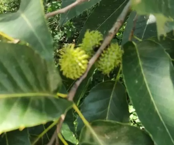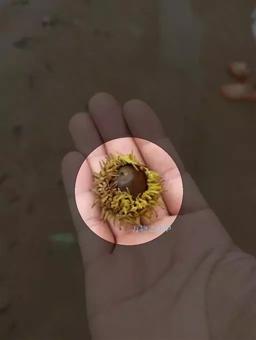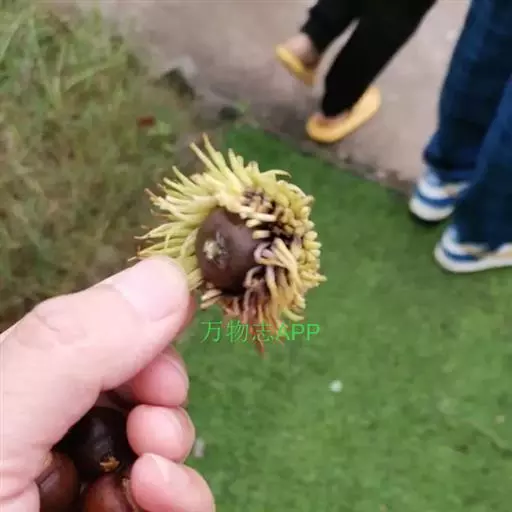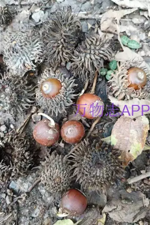 坚果近球形或宽卵形,高、径约1.5厘米,顶端圆,果脐突起。花期3-4月,果期翌年9-10月。