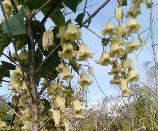 聚伞圆锥花序腋生,与叶近等长,花序梗长7-12厘米,在花序的分枝处生一对膜质的苞片,苞片卵圆形或卵状椭圆形,长1.5-2厘米,全缘或有时3裂;花萼钟状,顶端微反卷,直径1.5-2厘米,芳香;萼片4枚,淡黄色,长方椭圆.形或窄卵形,长1.5-2.5厘米,宽0.5-1厘米,内面无毛,外面被平伏的短柔毛,边缘被白色绒毛; 雄蕊长为萼片之半(长1-1.5厘米),花丝线形,被开展的柔毛,花药黄色,长椭圆形,长2-3毫米;心皮被短柔毛,花柱被绢状毛。