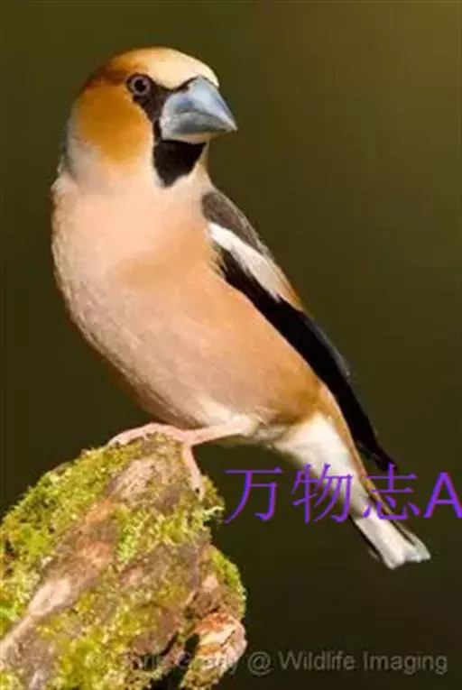 锡嘴雀(学名:Coccothraustes coccothraustes):全长184厘米,头顶棕褐,头侧及腰和尾上覆羽等较淡;后颈灰色,翕和下背微褐;翅上的内侧覆羽白,形成宽阔白色带斑;外侧覆羽及飞羽黑色,后者先端具紫色和蓝绿色光辉,内翈具白色斑;尾羽大都黑褐色,先端白色;嘴基周围及眼先黑,至喉则形成大形黑斑;下体余部淡黄褐,至下腹及尾下覆羽转白。雌鸟羽色较雄者暗淡,头顶褐灰。