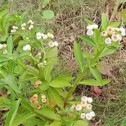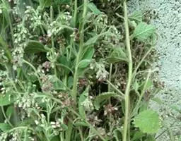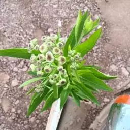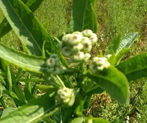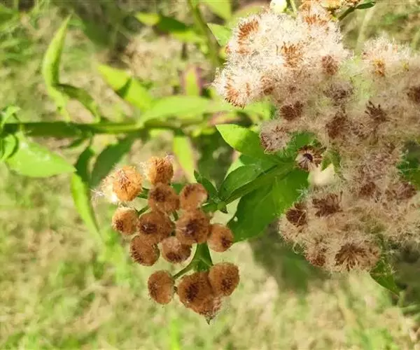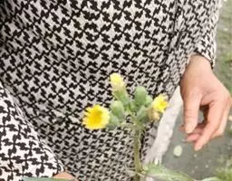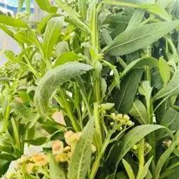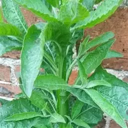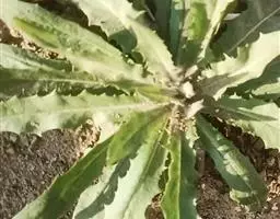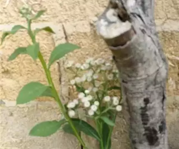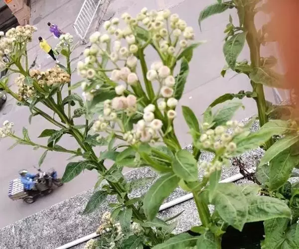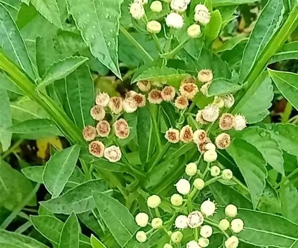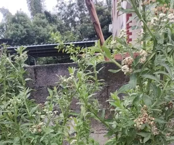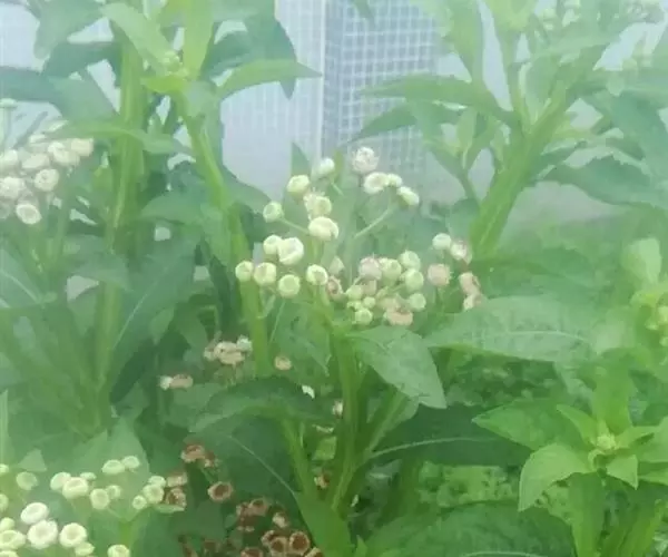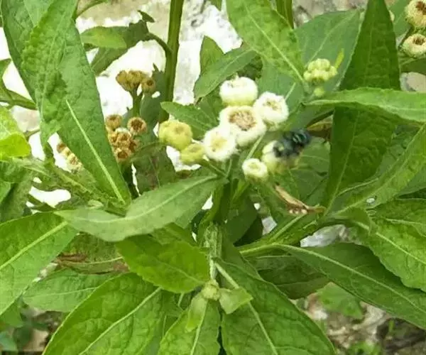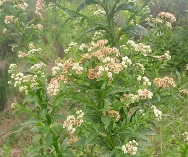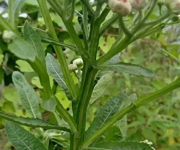 翼茎阔苞菊是一年生草本植物,茎直立,全株具浓厚的芳香气味,且被浓密的绒毛,最明显的特征是自叶基部向下延伸到茎部的翼。