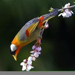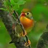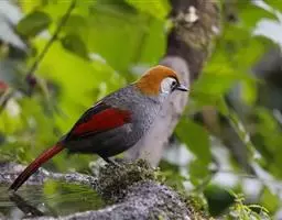银耳相思鸟小型鸟类,体长14~18厘米。头顶黑色,耳羽银灰色,前额橙黄色;外侧飞羽橙黄色,基部朱红色,…