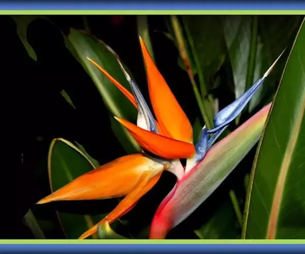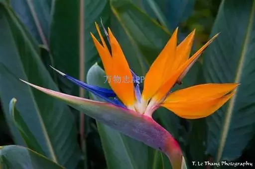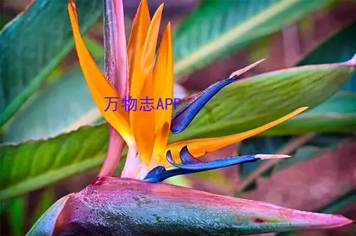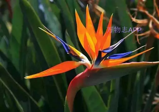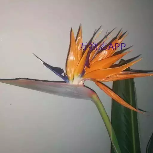 鹤望兰(Strelitzia reginae Aiton)芭蕉科鹤望兰亚科 多年生草本植物,无茎。叶片长圆状披针形,长25-45cm,宽10cm。叶片顶端急尖;叶柄细长。花数朵生于总花梗上,下托一佛焰苞;佛焰苞绿色,边紫红,萼片橙黄色,花瓣暗蓝色;雄蕊与花瓣等长;花药狭线形,花柱突出,柱头3。花期在冬季。