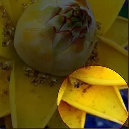 危害症状:又称棉红蜘蛛。被害叶初呈黄白色小斑点,严重时叶片卷曲,枯黄脱落,影响生长或不开花,成螨体长0.5-0.6毫米,雌螨卵圆形,朱红到绣红色,或黑褐色。雄螨略成菱形,淡黄色,略小。喜欢群居在叶背取食,高温干旱季节此病易爆发。