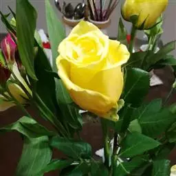 丰花月季灌木高0.9-1.3米,小枝具钩刺或无刺、无毛,羽状复叶,小叶5-7片,宽卵形或卵状长圆形,长2.3-6.0厘米,先端渐尖,基部近圆形或宽楔形。具尖锯齿,无毛,叶柄及叶轴疏生皮刺及腺毛,托叶大部与叶柄连合,花单生或几朵集生,呈伞房状,花径4~6厘米,花梗3-5厘米,常被腺毛,萼片卵形,花瓣有深红、银粉、淡粉、黑红、橙黄等颜色,重瓣,花柱分离,子房被柔毛,蔷薇果卵球形,径1.0-1.2厘米,红色,花期5月底一11月初,果期9-11月。