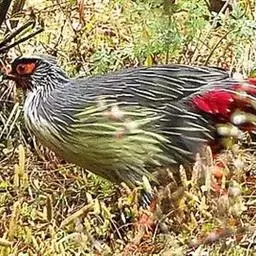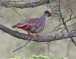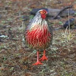血雉雉科血雉属鸟类,别名血鸡、松花鸡,血雉的雄鸟大覆羽、尾下覆羽、尾上覆羽、脚、头侧、腊膜为红色,…