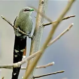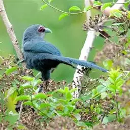 绿嘴地鹃:体形似小鸦鹃,但羽色大致绿灰;嘴绿色,头侧眼的周围有一裸区;后爪弯曲。虹膜赤红色,…