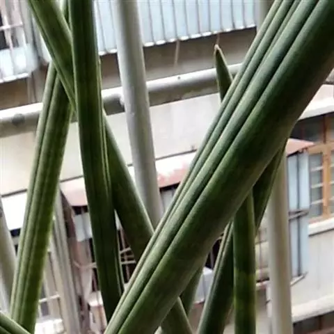 圆叶虎尾兰又名棒叶虎尾兰、筒叶虎尾兰、筒千岁兰等,茎短或无,肉质叶呈细圆棒状,顶端尖细,质硬,直立生长,有时稍弯曲,叶长80~100厘米,直径3厘米,表面暗绿色,有横向的灰绿色虎纹斑。总状花序,小花白色或淡粉色。