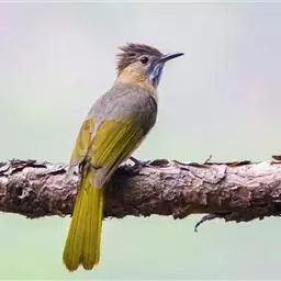黄腹冠鹎:体长19-24厘米,是一种体型略大的褐色鹎。头顶橄榄褐色具黑褐色羽冠。白色的喉膨起,…