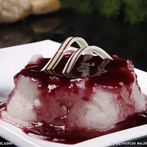 5.15克藕粉用少许凉白开溶化,然后倒入锅中,小火搅拌至非常粘稠,然后趁热倒入容器内,待冷却后即可切块食用