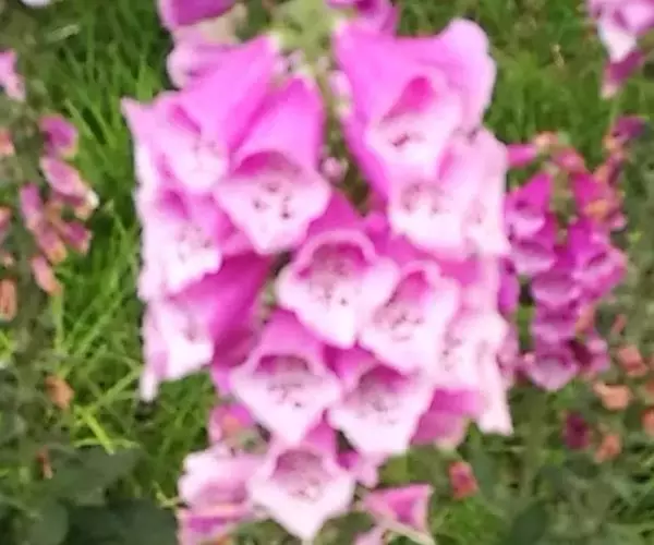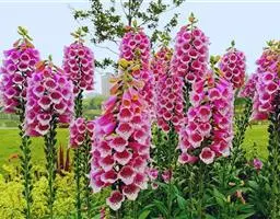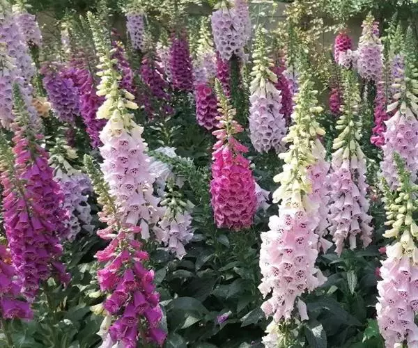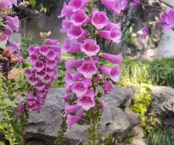毛 地黄(Digitalis purpurea L) :为玄参科、毛地黄属二年生或多年生草本植物。除花冠外,全体被灰白色短柔毛和腺毛,有时茎上几无毛,高60-120厘米。茎单生或数条成丛。叶片卵圆形或卵状披针形,叶粗糙、皱缩、基生叶具长柄,卵形至卵状披针形,叶缘有圆锯齿,叶柄具狭翅,叶形由下至上渐小。顶生总状花序长50~80cm,花冠钟状长约7.5cm,花冠蜡紫红色,内面有浅白斑点。蒴果卵形,花期5~6月,果熟期8~10月,种子极小。人工栽培品种有白、粉和深红色等,一般分为白花自由钟,大花自由钟,重瓣自由钟。常用于花境、花坛及岩石园中,还可作自然式花卉布置。
