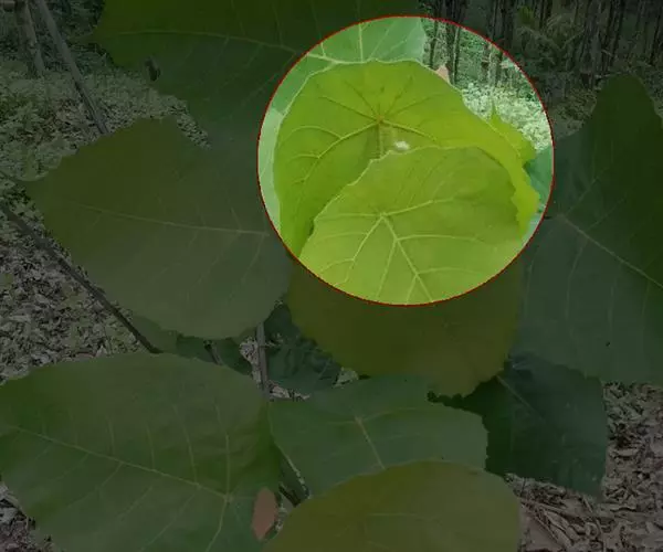 叶互生;叶柄长6-31厘米,向上扭曲,盾状,着生于叶片的近 中心处;叶片圆形,直径3-10厘米,有主脉9条.由叶柄着生处向四面放射,边缘为波浪形的浅缺刻,背面通常被疏毛或有乳凸点。
