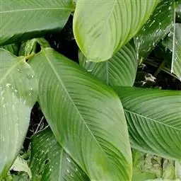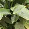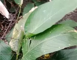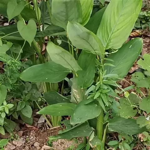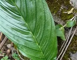 叶宽矩圆形,长8厘米至15厘米,宽7厘米至10厘米,基部心形,前端尖凸,正面淡绿色,有光泽,侧脉6对至8对,脉间有两列对称呈羽状排列的斑纹,初为灰褐色,后呈深绿色,叶背灰绿色。 柄基部鞘状。