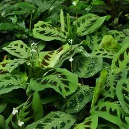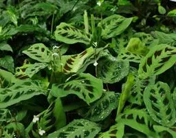 应依据“勤施薄施”的原则,生长旺季每2周施一次花生麸与复合肥的混合肥或腐熟堆肥。肥料的营养成分应以氮肥为主,磷、钾肥次之。由于竹芋为观叶植物,适当增施氮肥,能使叶片色泽更加优美。另外,可用含氮量达46%的尿素配制成0.1%的溶液,加含磷大于50%、含钾大于30%的磷酸二氢钾配制成0.2%的溶液作根外追肥,在早上露水未干时或傍晚施用效果较好。喷施时要用细孔喷雾器把叶片正反两面全喷到,每周喷1次,连续喷施3次后停止1次,然后再连续喷施。特别要注意的是施肥的浓度不宜过大,否则易引起叶片灼伤造成肥害,严重时甚至引起植株枯死。冬季休眠期和夏天太炎热时,要停止施肥。