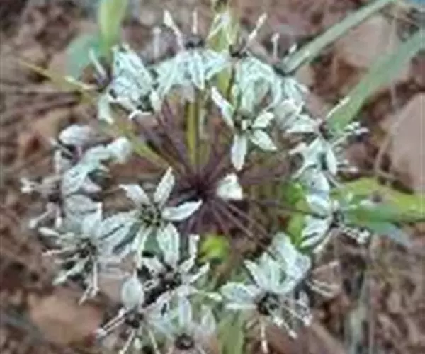伞形花序球状,无珠芽,具多而密集的花;小花梗近等长,比花被片长数倍,基部具小苞片;花白色至淡紫色;花被片近矩圆形,长4.5~5毫米,宽2~2.3毫米,先端钝,具短尖头,中脉绿色,外轮的背面沿中脉具细齿;花丝稍比花被片长,基部合生并与花被片贴生,两侧的下部具细齿,内轮的下部约2/3扩大成长方形,扩大部分与花被片近等宽,每侧各具1齿,齿端延长成卷曲的丝状,远比中间着药的花丝长,外轮的无齿,下部稍扩大成狭长的条状三角形;子房卵球状,在中下部沿腹缝线具横向隆起的蜜腺(在标本上不易观察到);花柱伸出花被外。花果期5-7月。