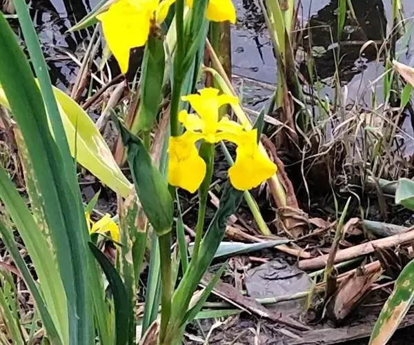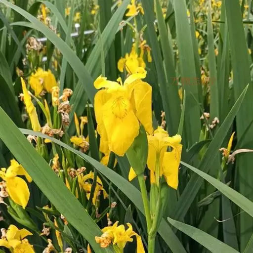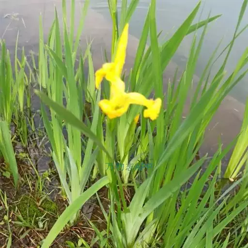 黄菖蒲(学名:Iris pseudacorus L.):是多年生湿生或挺水宿根草本植物,植株高大,根茎短粗。叶子茂密,基生,绿色,长剑形,长60-100厘米,中肋明显,并具横向网状脉 。花茎稍高出于叶,垂瓣上部长椭圆形,基部近等宽,具褐色斑纹或无,旗瓣淡黄色,花径8厘米。蒴果长形,内有种子多数,种子褐色,有棱角。花期5-6月份。