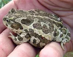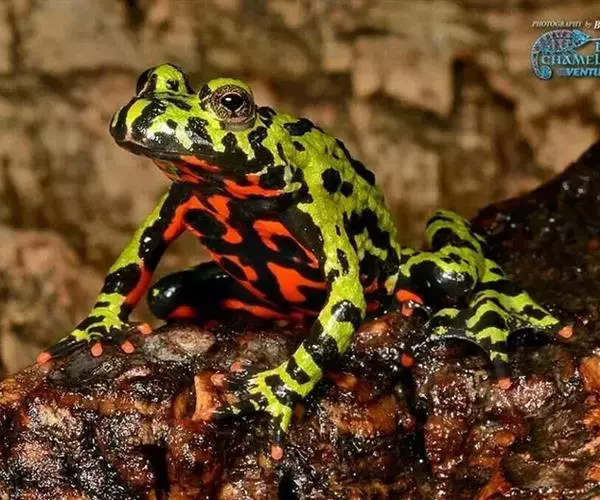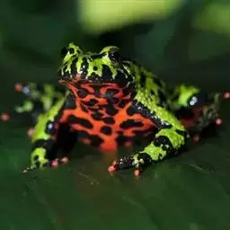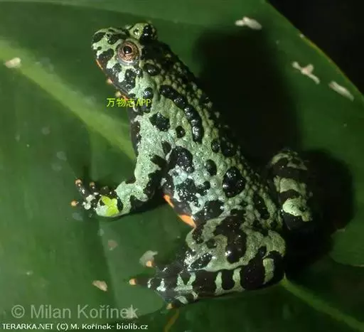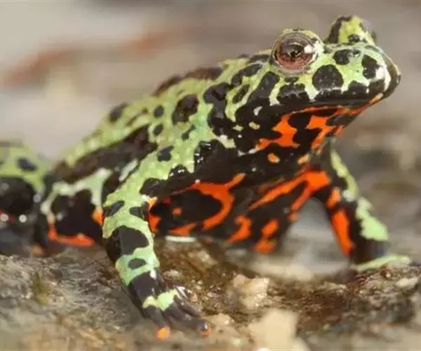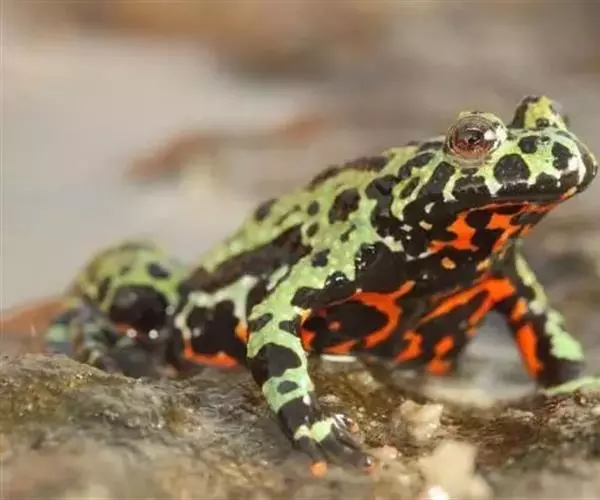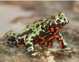 东方铃蟾(学名:Bombina orientalis)是铃蟾科、铃蟾属两栖动物。体长36-48毫米左右头扁平,吻圆,前、后肢短,皮肤粗糙,刺黑色,背部呈灰棕色,或背为绿色杂以不规则的黑色斑点,腹面有花斑,为黑色与朱红色或桔黄色。雄性前肢较粗壮,前臂直径为体长的11%(雌性8.4%),前臂内侧、内掌突及内侧3指基部有黑色细刺;无声囊和雄性线。雄性趾间为全蹼,雌性的蹼缺刻较深。