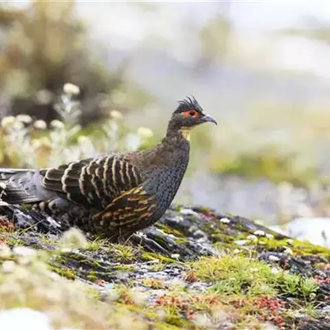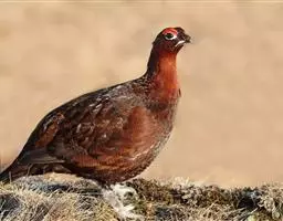 体大的灰褐色鹑类。胸灰色具黑色细纹。与相似种类四川雉鹑不同处在于栗色喉块外缘近白。有猩红色眼周裸皮。…