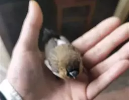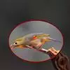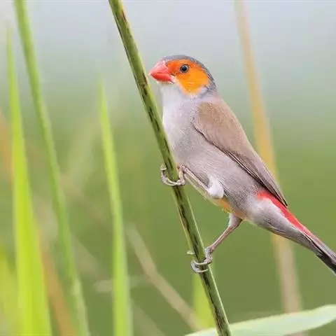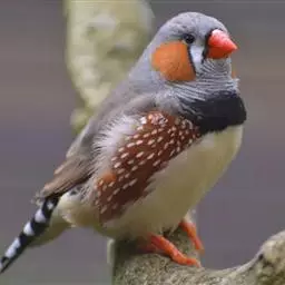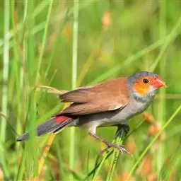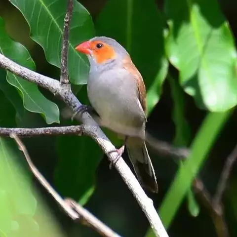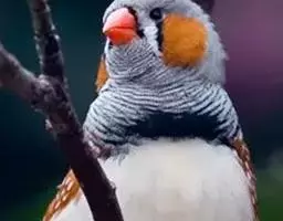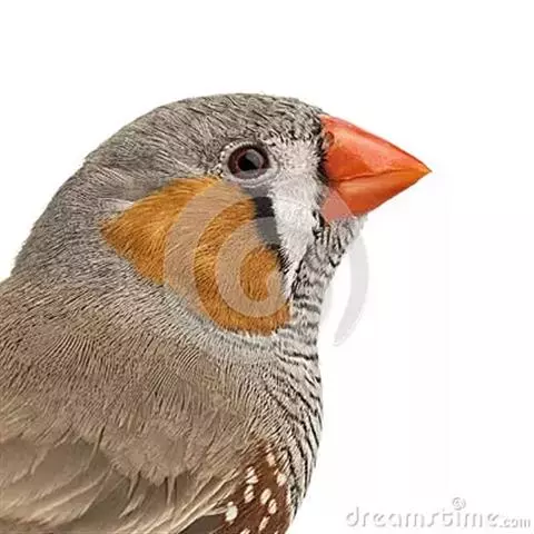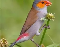 橙颊梅花雀体长约10厘米,头部灰色,两侧有大块橙色区域,嘴基及眼下方有黑纹,两条黑纹间呈白色,…