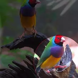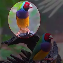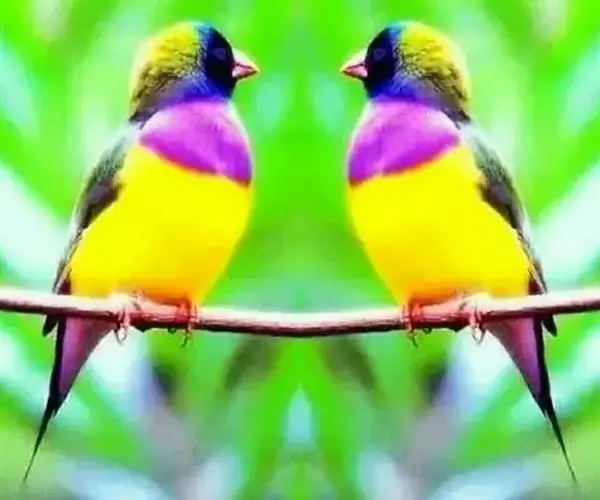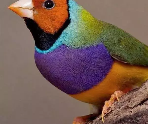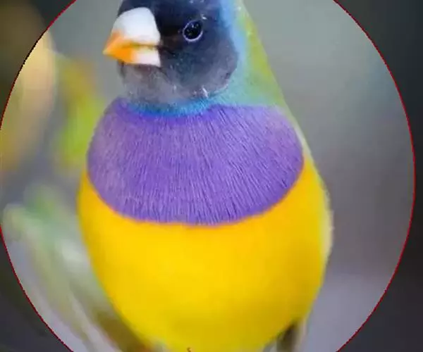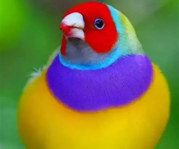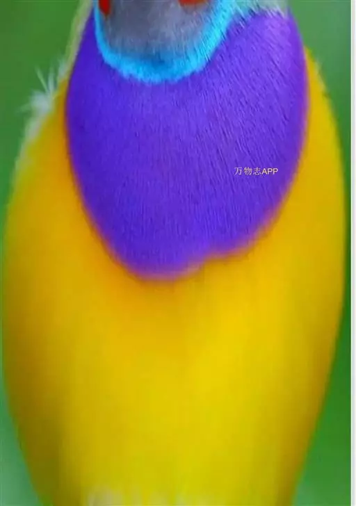 七彩文鸟的胸部的颜色也有3种,紫色、淡紫色和白色。紫色胸的七彩文鸟最为常见。雄鸟胸部紫色十分艳丽,雌鸟的紫色相对浅一些。而白胸则显得十分干净高雅。淡紫色胸的七彩文鸟相对稀少,而且很多初学者很容易将紫色胸雌鸟错认为是淡紫色胸七彩文鸟。有一个比较简单的分辨方法,淡紫色胸的雄鸟的胸和腹部的分界线十分清晰,而雌鸟胸部和腹部的分界线不清晰,有类似过渡色的感觉。无论什么样的背色和胸色,雌雄七彩文鸟的腹部都是黄色的。在绿背七彩文鸟的头和背部之间,雌雄鸟都有一个如松石蓝绚烂的蓝色脖环。而在蓝色脖环和头色之间还有一圈同时与下巴相连接的黑色细环。嘴尖的颜色通常为红色(双黄头基因的黑头七彩的嘴尖颜色为黄色),而在雌鸟进入发情期后,其嘴尖颜色会明显发黑发暗。整体而言,雄性七彩文鸟的颜色更鲜艳夺目,而雌性则颜色暗淡一些。雄鸟的尾羽有一根长长的燕尾。一般我们管绿背紫胸的七彩文鸟称之为“普彩”,绿背白胸的七彩文鸟称之为“高彩”。