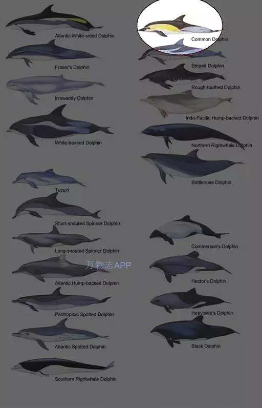 真海豚,身体细而流线型。体色十分复杂而独特,通常十字交叉型,黄褐色在前灰色在后,背面黑色向下延伸,…