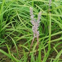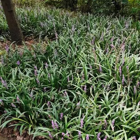 银纹沿阶草百合科沿阶草属,多年生草本,高约5~30cm。叶丛生,无柄,窄线形,革质,叶面有银白色纵纹,叶端弯垂。总状花序具15~20朵花,花常生或2~3朵簇生苞片腋内,花小,淡蓝色,夏季开放;果期8~10。