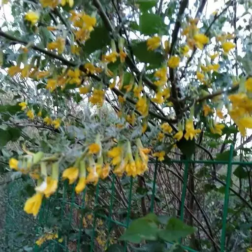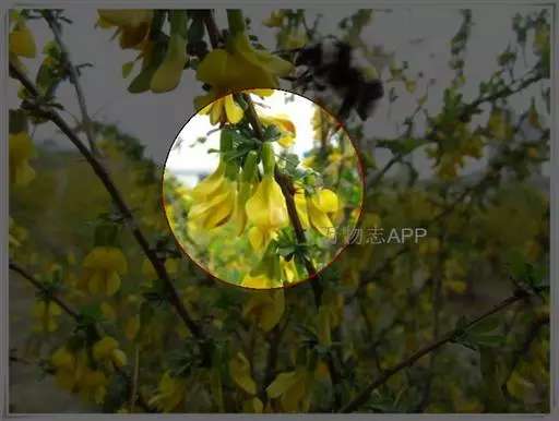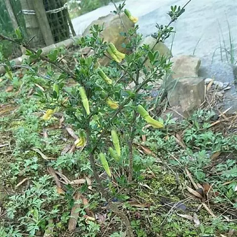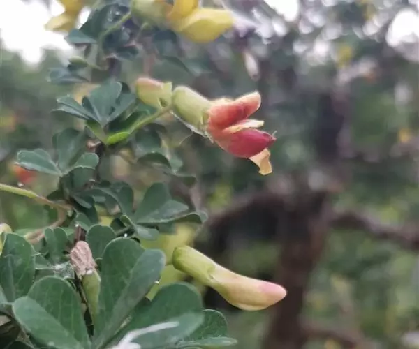 花单生,花梗长约1厘米,中部有关节;花萼钟状,长12-14毫米,宽6-9毫米,基部偏斜;花冠黄色,常带红色,长2.8-3厘米,旗瓣狭倒卵形,具短瓣柄,翼瓣稍长于旗瓣,瓣柄与瓣片近等长,耳短小,龙骨瓣宽钝;子房无毛。荚果圆筒状,长3-3.5厘米,宽约5毫米。花期4-5月,果期7月。