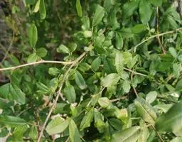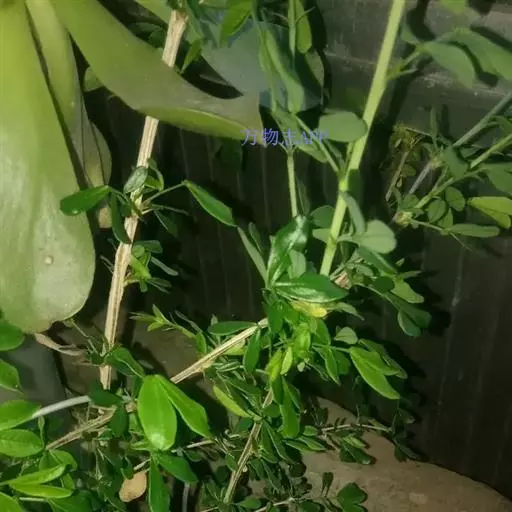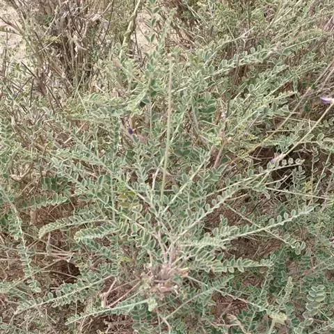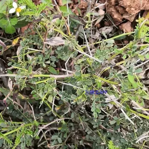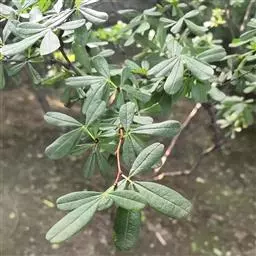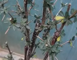 灌木,高1-2米。树皮深褐色;小枝有棱,无毛。托叶三角形,硬化成针刺,长5-7毫米;叶轴脱落或硬化成针刺,针刺长7-15(25)毫米;小叶2对,羽状,有时假掌状,上部1对常较下部的为大,厚革质或硬纸质,倒卵形或长圆状倒卵形,长1-3.5厘米,宽5-15毫米,先端圆形或微缺,具刺尖或无刺尖,基部楔形或宽楔形,上面深绿色,下面淡绿色。